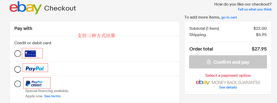 ebay上的消费大多都是通过Paypal来完成的,少数商家可以直接使用信用卡付款, Paypal对于ebay来说就好比支付宝对于淘宝一样,绑定在一起的铁哥们儿。后面我们会重点说说Paypal这种付款方式。