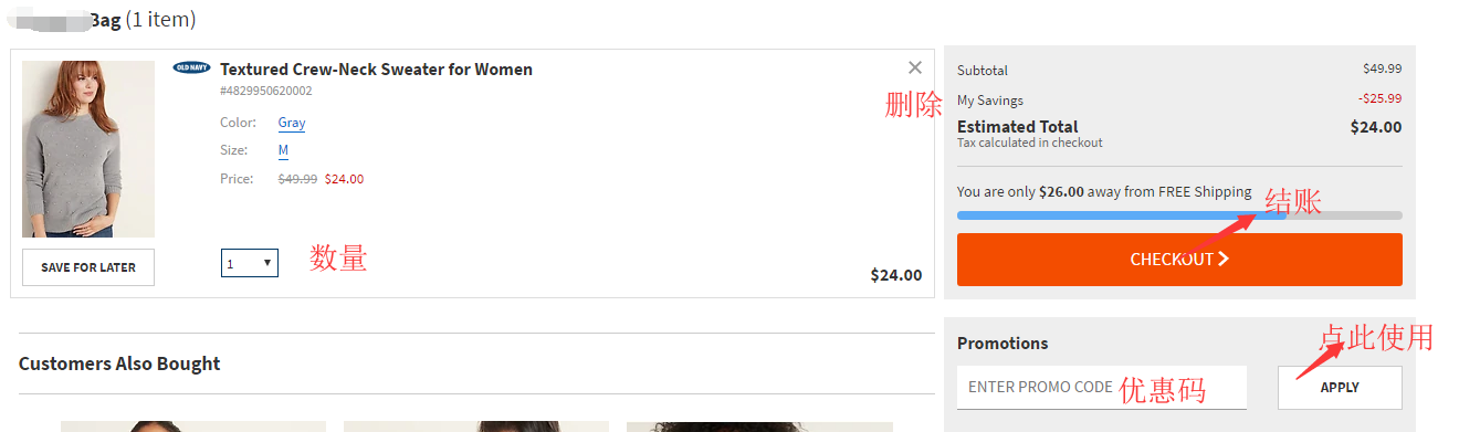 进入购物车结算页面,可以选择增加商品数量或者选择不要哪些产品等;如果有商家优惠码,也可在此输入使用获得折扣。确认无误后点击checkout去结算。