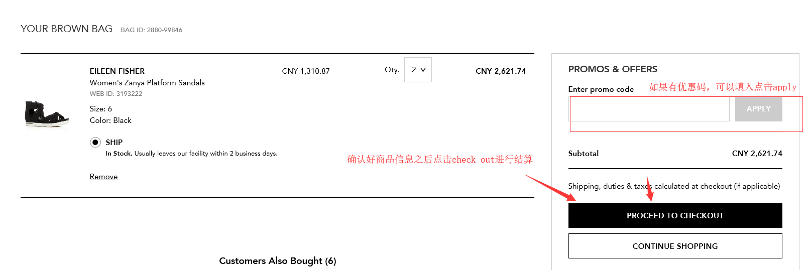 进入购物车页面之后,确认商品信息,输入优惠码,点击Proceed To Checkout进入下一步的结算。
