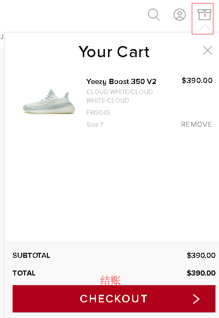 小编这里就以购买个人最爱的Yeezy鞋为例啦,点击进入商品具体信息页面,选择适合自己的尺码,然后点击“Add to Cart加入购物车”。