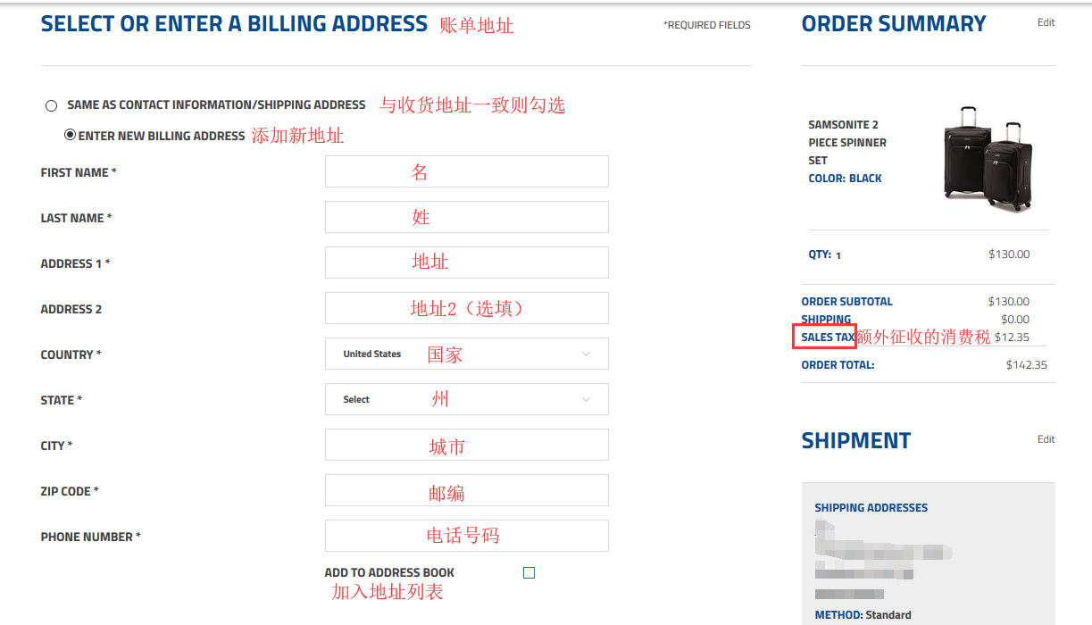 对应填写账单地址即可,右侧sale tax为填入收货地址后产生的消费税