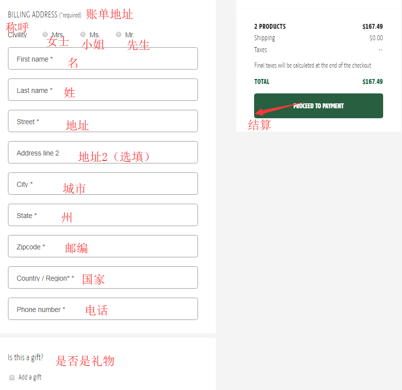 选好邮寄方式之后,下一步就是填写收货地址,前面提到Lacoste不支持直邮,只能转运,所以此处地址就如实填写转运公司给你的地址即可;