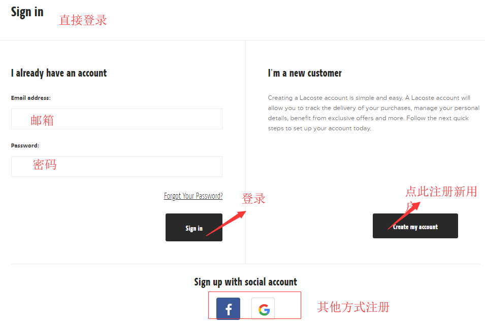 已有账户的客户可以选择Sign in使用邮箱,密码直接登录,没有账户的,点击CREAT MY ACCOUNT注册新账户;