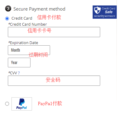 这里可以选择信用卡或者是paypal付款,一般支持国卡的商家使用信用卡付款也比较方便的,当然需要填写你的个人信用卡真实信息了。