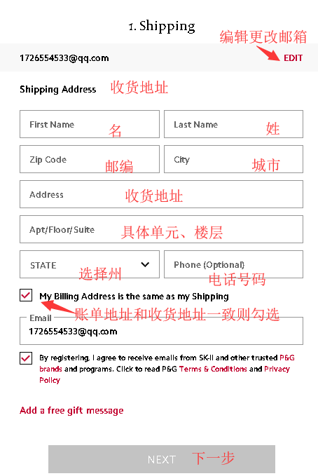 现在需要输入收货地址信息,填好之后点击“Next”下一步。(因为SK-II美国官网不支持直邮中国,所以这里的收货地址要填写转运公司给你的美国仓库地址。还要注意的是这里的的账单地址默认和收货地址一样了,需要把“√”去掉,然后用拼音填写你支付信用卡的真实账单地址,这样才能降低被砍单的概率)