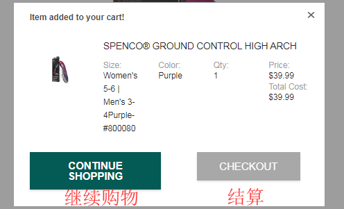 如果想继续购物则点击continue shopping返回商家页面购买其他产品,如果想结算,则可以点击checkout去购物车结算即可。