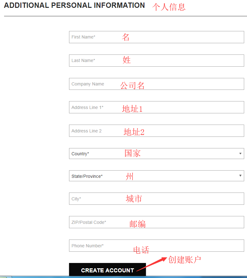 然后需要在ADDITIONAL PERSONAL INFORMATION一栏输入具体个人信息,比如姓名,地址,邮编,电话号码等,最后点击create account完成注册即可开始海淘啦!