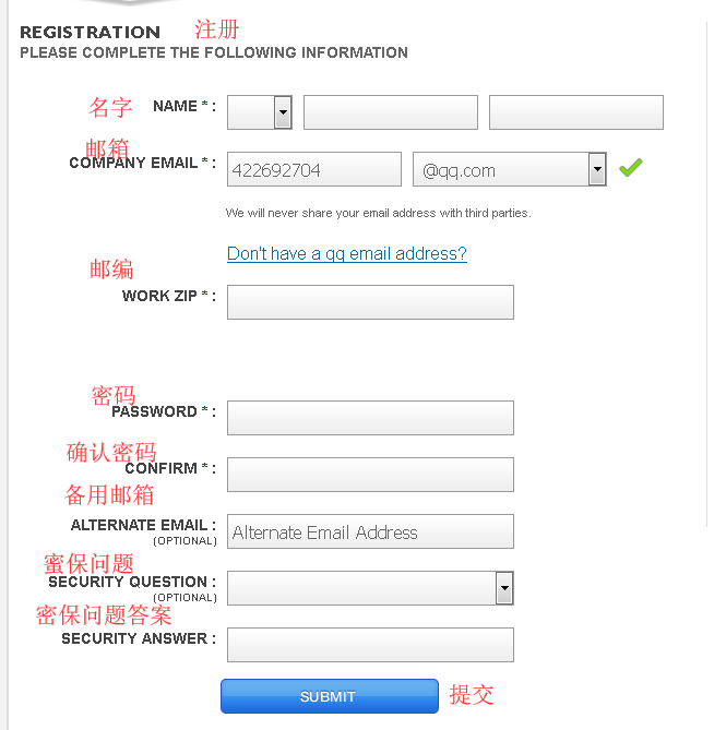 接着会直接跳转到注册页面,按要求填写相关个人信息即可,带“*”的为必填选项,填好之后点击“Submit提交”即可。(密码需要包含至少一个大写字母,至少一个特殊字符,比如“@、&”)