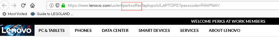 接着点击“Shop Now购物”就会跳转到联想8通道,地址栏中包含perksoffer字样,此时我们就可以享受第八通道优惠啦!
