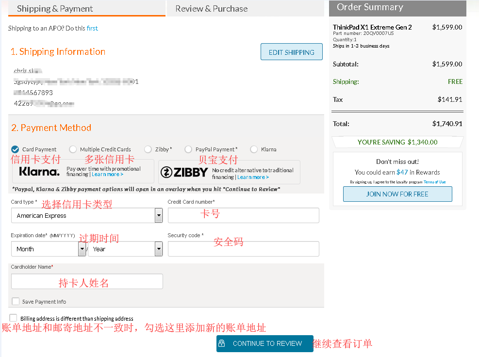 最后点击“Continue to Review”查看订单,仔细核对购买产品的相关信息、送货地址、配送方式、付款方式、等,准备无误的话就可以付款下单。联想美国官网8通道的下单流程大致就是这样了,是不是也没有想象的那么难呢?