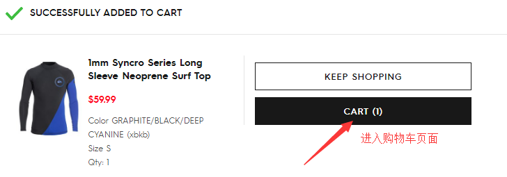 根据商品分类找到想要购买的产品,进入到产品具体页面,点击购买。以下面这款冲浪服为例,选好颜色尺码之后,点击"Add to Cart"加入购物车。