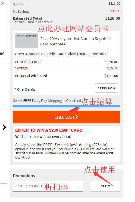 办理Banana Republic卡还能享8折优惠,也可在此处点击进行办理;如果商家有优惠码可以在promo code一栏输入获取折扣,然后点击checkout进行结算。