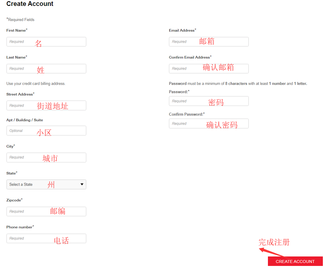 如果是新用户,需要点击Create Account输入邮箱,密码,姓名以及收货地址等信息等完成注册。(由于Champion不支持直邮中国,所以地址栏需要填写转运公司所给地址)。