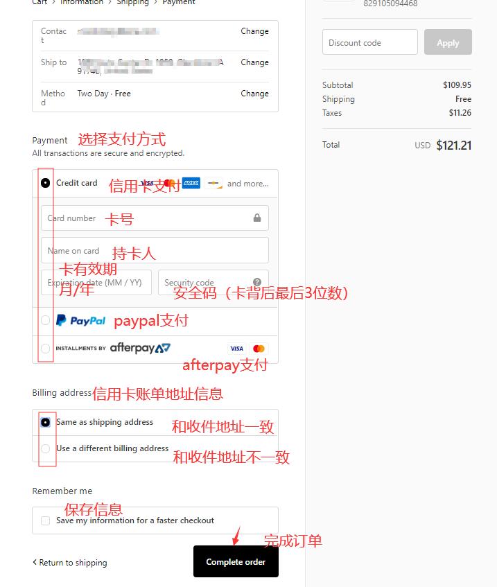 3. 1)选择支付方式:可以使用信用卡,paypal,afterpay,你使用哪种就选择哪种,本文以信用卡支付为例,填写卡号信息