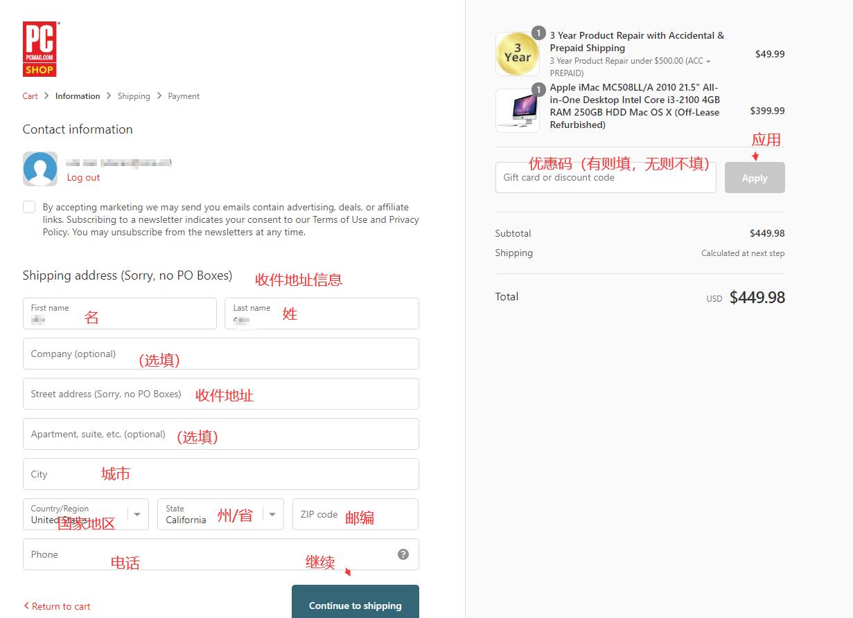 1) 使用优惠码 & 填写收件地址:即转运公司提供给你的转运地址信息,后文有详细的转运攻略