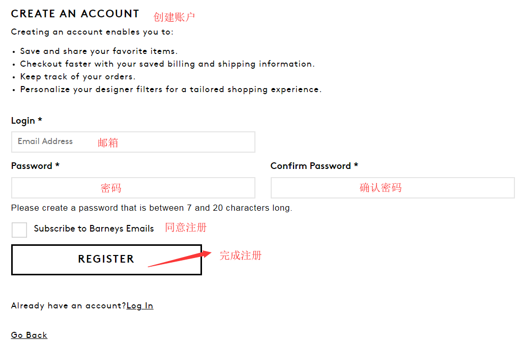 打开Barneys官网链接https://www.barneys.com/ ,点击主页右上方LOG IN / REGISTER开始注册;