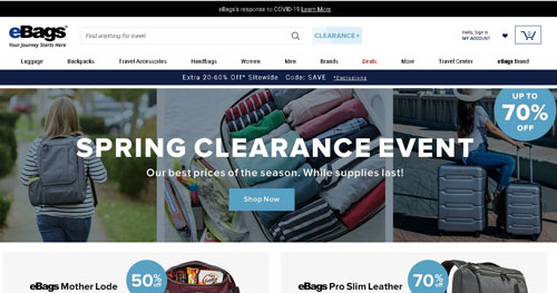eBags是美国知名箱包类B2C网店,提供全系列高档、流行箱包品牌——包括新秀丽(Samsonite)、JanSport、The North Face(北脸)和Eagle Creek(鹰溪)等。其产品种类丰富,包括旅行箱、电脑包、男式商务用系列、斜挎小包、运动类背包、钱包、妈咪包、学生书包、儿童行李箱等等,基本你能想到的都有。并且质量上乘、做工精致、性价比高,是海淘各类包包网不可错过的胜地。