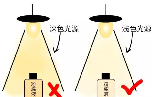 试粉底液的时候,一定要注意光线的强弱和光的颜色。一些专柜为了产品陈列更好看,会选择黄光的射灯来照射,这样会让妆容看起来比实际颜色更深,很容易选择了偏白的颜色的粉底液。
